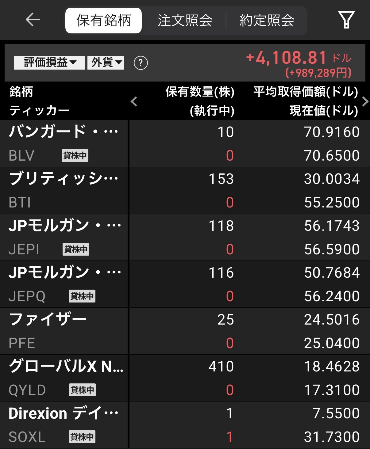 - 為替は、1ドル=156.54円(日本時間24日午後時点)と、先週からさらに円安・ドル高が進行しています。通常であれば円安は日本株の追い風になるはずですが、今週はそのセオリーが通用せず、「円安でも日本株が売られる」という懸念すべき動きが見られました。ただ、ドル建て資産(米国株やJEPQなど)の円換算評価額にとっては、この円安がせめてもの救いとなっています。