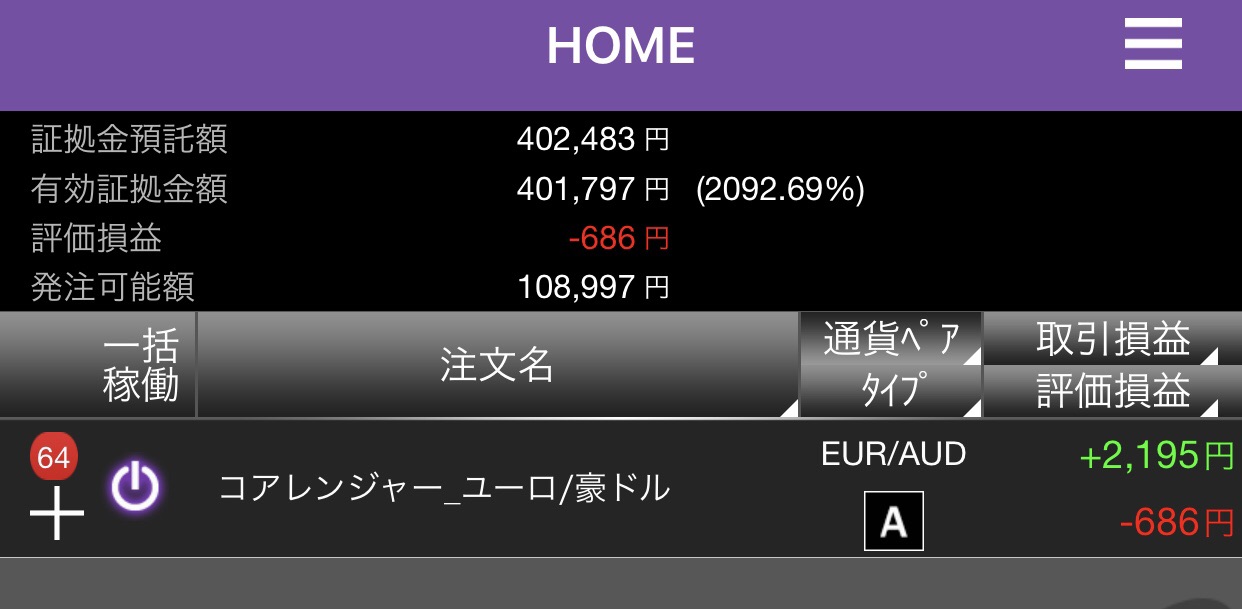 新ロジックで新たな始めたのは、コアレンジャー ユーロ/豪ドルです。