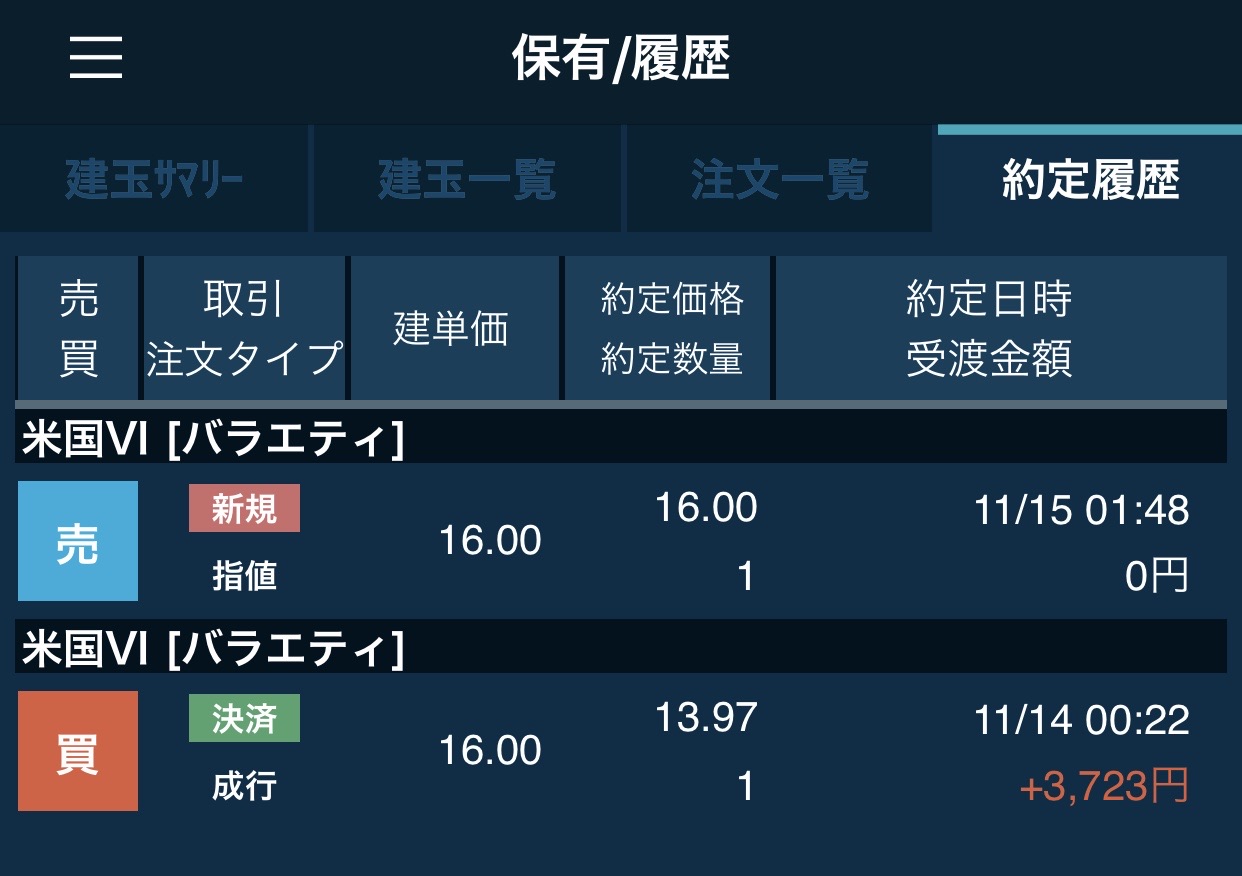 今週は、価格調整日があって、価格調整後の指数が16近くになると思い、一旦売りのポジションを決済しまた、16にポジション指定の売り注文をしました。